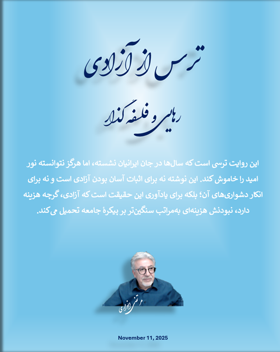 ترس از آزادی در ایران، اگرچه ساخته و پرداخته دستگاه قدرت است، اما مطلق و دائمی نیست. این ترس، مانند هر هیجان انسانی دیگر، در برابر حقیقت، تجربه و آگاهی میتواند عقبنشینی کند. استبداد میتواند به مردم بگوید آزادی خطرناک است، اما نمیتواند برای همیشه پنهان کند که خطر واقعی، همان وضعیتی است که کشور در آن گرفتار شده است.