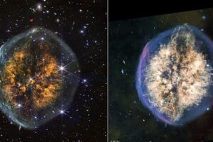 ناسا جیمز وب تصویری خیرهکننده از سحابی جمجمه ثبت کرد؛ ساختاری شبیه مغز انسان که حاصل آخرین نفسهای یک ستاره است. تلسکوپ فضایی جیمز وب در جدیدترین رصد خود، تصویر خیرهکنندهای از یک سحابی با ظاهری شبیه به مغز یا جمجمه انسان (سحابی PMR 1) ثبت کرده است؛ تصویری که مراحل پایانی و شگفتانگیز مرگ…
